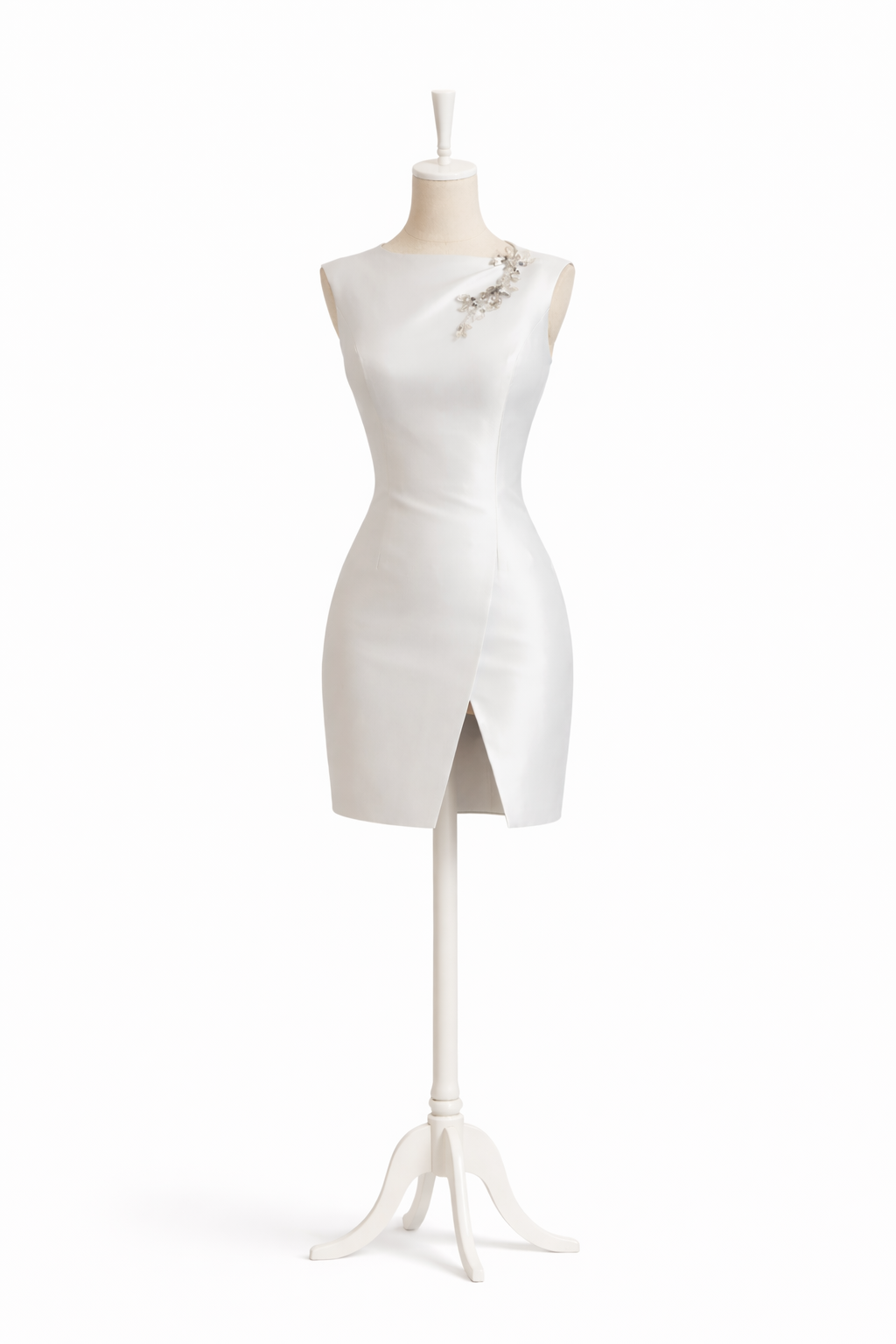 he Ivory Grace Embellished Mini Dress is designed with a refined, fitted silhouette that highlights clean lines and timeless elegance. Crafted in a soft ivory tone, the dress features a subtle front slit for ease and movement.