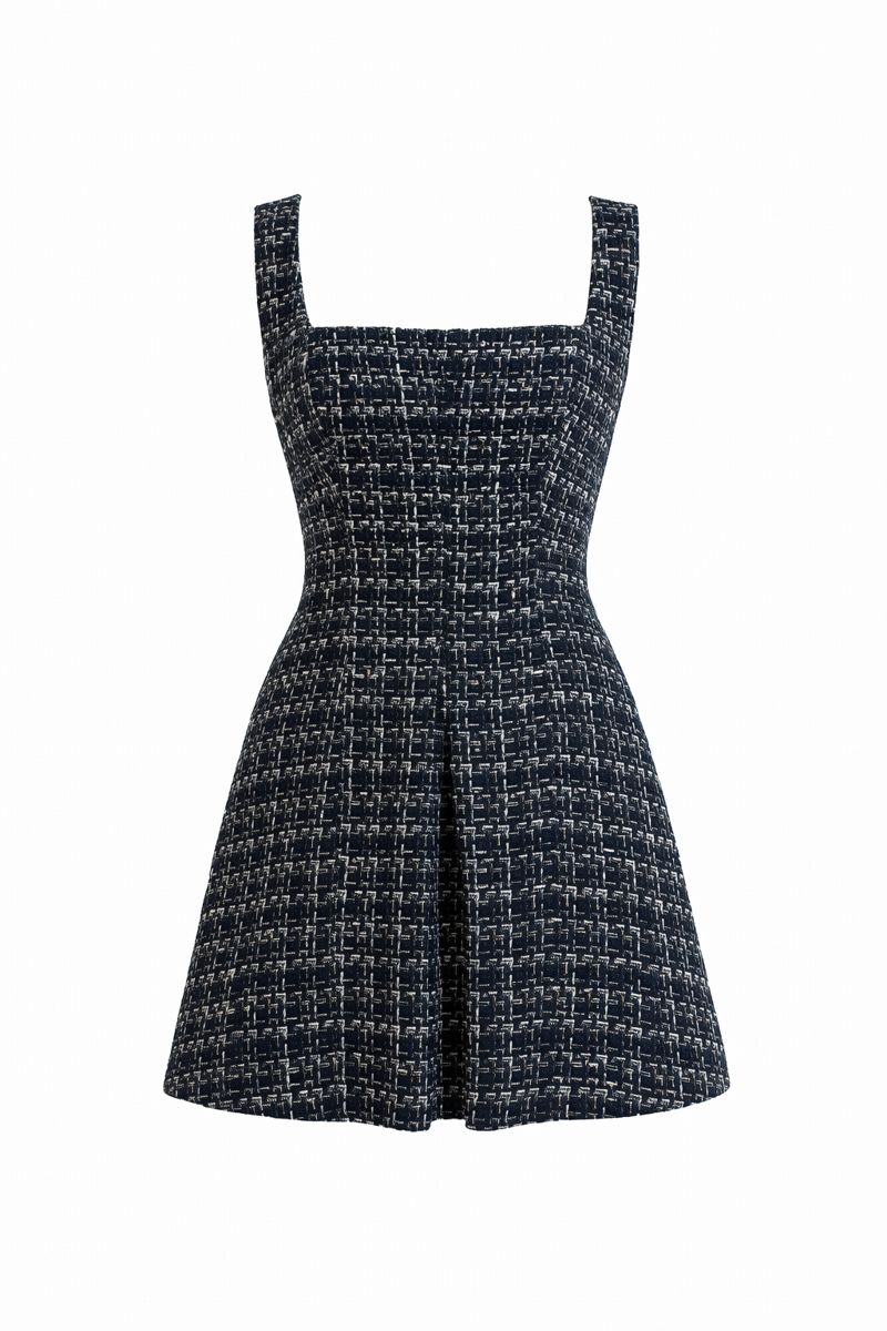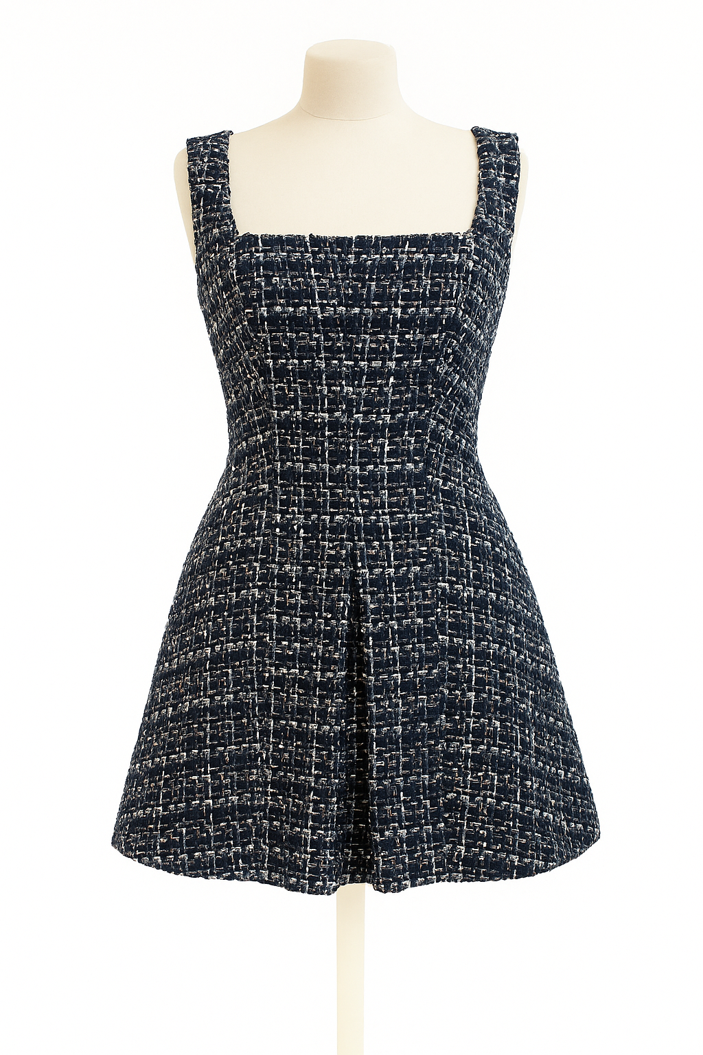 The Noir Tweed Square-Neck Mini Dress is designed with a refined, tailored shape that accentuates the waist while offering a timeless, elegant look. Crafted from textured tweed fabric, the dress features wide shoulder straps and a clean square neckline for a modern, structured finish.